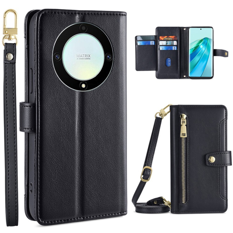 Cette housse qui sert de portefeuille protège votre Honor Magic 5 Lite 5G et vient avec une lanière et une bandoulière.