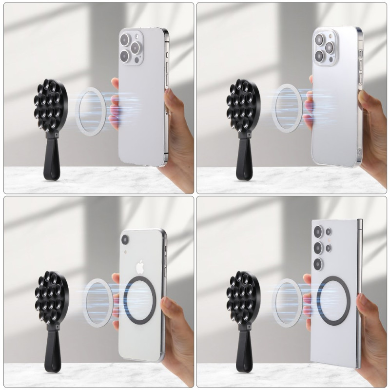 Ce support téléphone magnétique à ventouse antidérapant offre une solution simple et ultra-polyvalente pour fixer votre smartphone sur n’importe quelle surface lisse : miroir, vitre, carrelage, écran d’ordinateur ou même réfrigérateur. Conçu pour MagSafe, il assure une fixation magnétique puissante et instantanée avec les iPhone 12 à 15 ou les coques compatibles. Son système de 14 mini-ventouses imite la structure d’un poulpe pour garantir une adhérence fiable. Fabriqué en silicone de haute qualité, il protège votre téléphone tout en restant flexible, durable et léger. Idéal pour créer du contenu, passer des appels vidéo ou transformer votre iPhone en webcam professionnelle.