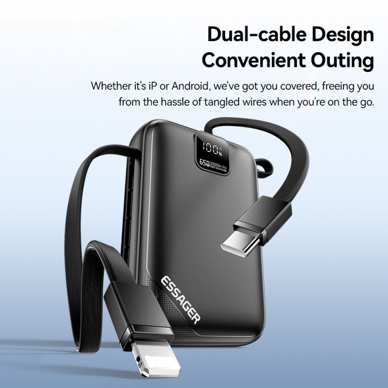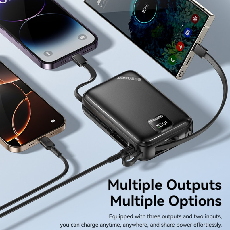 Le niveau de puissance requis pour un ordinateur portable haut de gamme est désormais disponible, intégrant une solution de charge complète. Cette Batterie Externe ESSAGER 20000mAh délivre une sortie maximale de 65W, assurant la recharge rapide des ordinateurs portables, des tablettes et des smartphones. L'intégration de câbles Type-C et Lightning élimine l'encombrement, tandis que sa capacité permet de maintenir vos dispositifs alimentés pendant plusieurs jours. Elle supporte une entrée de 60W pour une recharge rapide de la batterie elle-même. Son affichage numérique intelligent permet une gestion précise de l'autonomie, et sa conformité aux normes européennes CE et RoHS atteste de sa fiabilité.