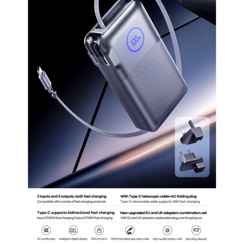 Pensée pour simplifier tous tes déplacements, cette batterie externe réunit chargeur mural, câble Type-C rétractable et adaptateurs EU/UK dans un seul appareil compact. Sa puissance de 35W permet une recharge rapide aussi bien pour tes appareils que pour la power bank elle-même. Le design pliable facilite le rangement, tandis que l’écran LED apporte une lecture claire du niveau d’énergie. Grâce à ses cellules polymère fiables, elle assure une charge stable et sûre où que tu sois.