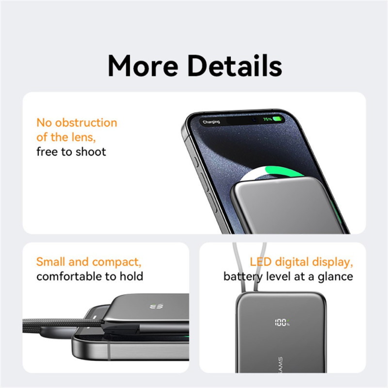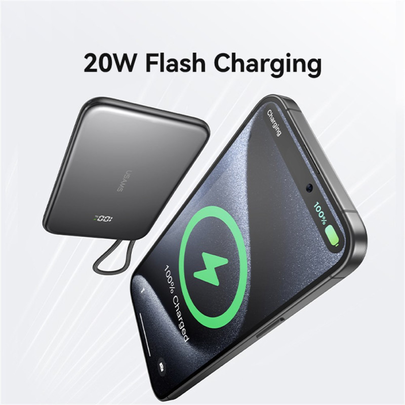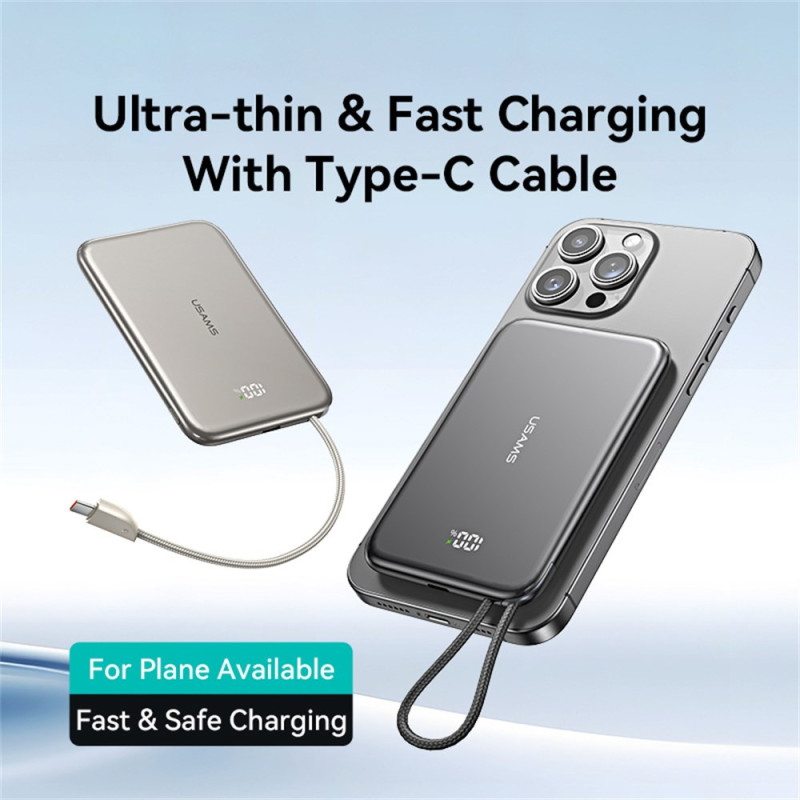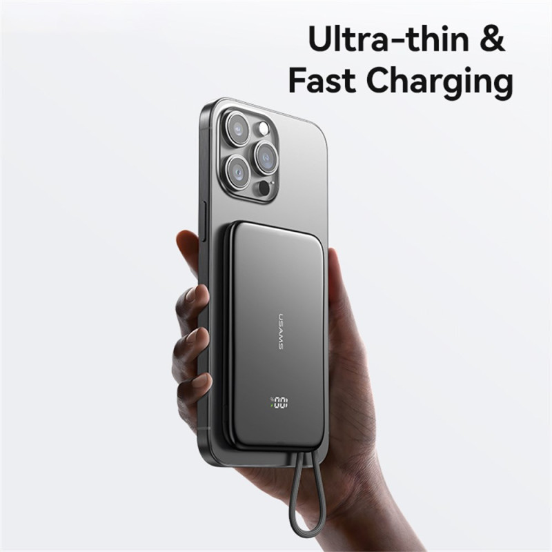 Cette batterie externe magnétique de 5000mAh associe finesse et performance pour une utilisation simple et confortable au quotidien. Son design ultra-fin se glisse facilement dans une poche, tandis que le câble Type-C intégré permet une recharge sans accessoires supplémentaires. La charge rapide 20W assure une alimentation efficace, et l’écran LED offre une lecture précise du niveau d’énergie. Grâce à sa fixation magnétique, elle se place naturellement sur les appareils compatibles. Les protections intégrées garantissent une utilisation sûre, même lors de charges prolongées.