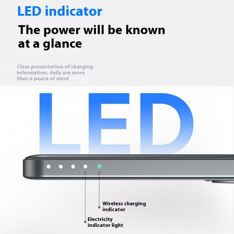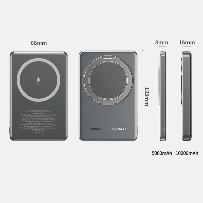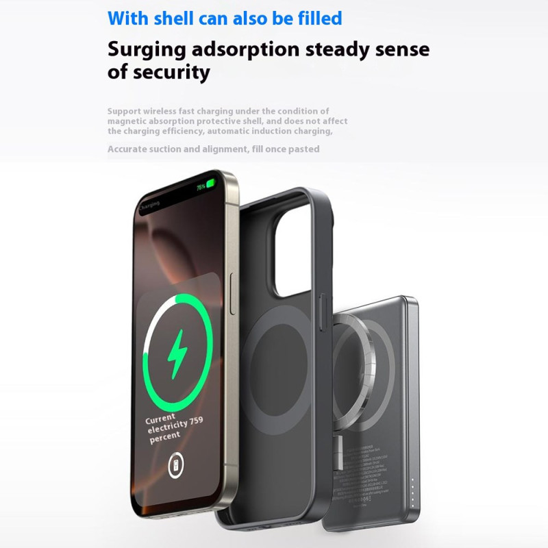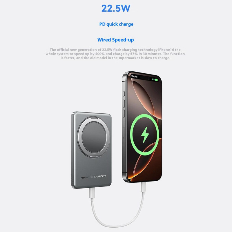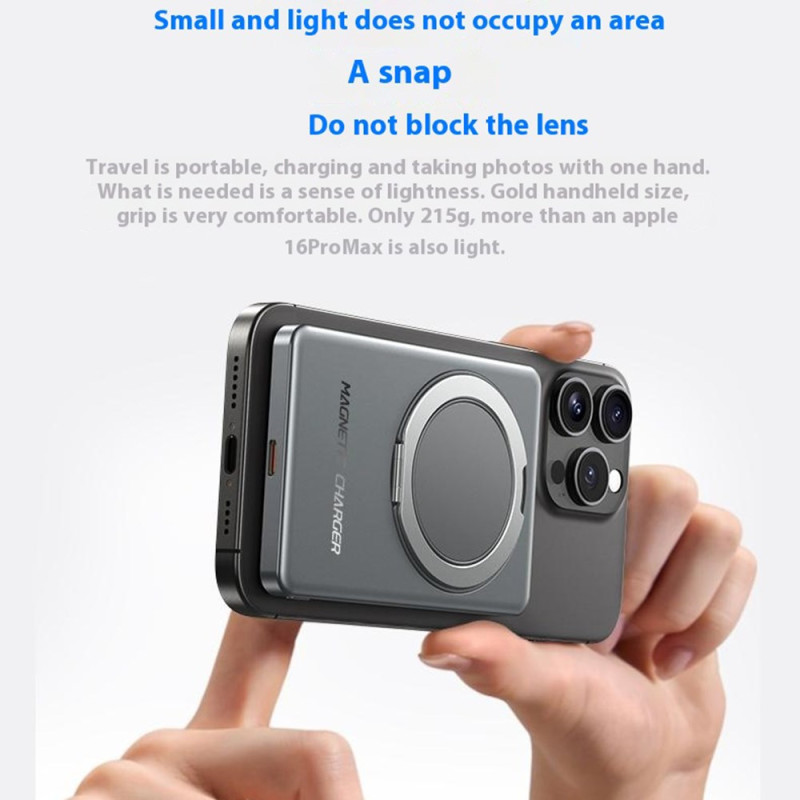 Cette batterie externe magnétique de 5000mAh combine puissance et praticité dans un format ultra-fin. Grâce à sa fixation magnétique renforcée, elle se clipse directement à l’arrière des iPhone compatibles MagSafe et offre une charge sans fil stable jusqu’à 15W. Elle propose aussi une charge filaire rapide pouvant atteindre 22,5W. Son écran LED affiche clairement le niveau d’énergie, évitant toute approximation. L’anneau métallique intégré sert de support pliable pour un maintien confortable ou une utilisation mains libres, idéal pour regarder des vidéos ou passer des appels. Avec son corps en alliage d’aluminium, elle reste légère et facile à transporter.
