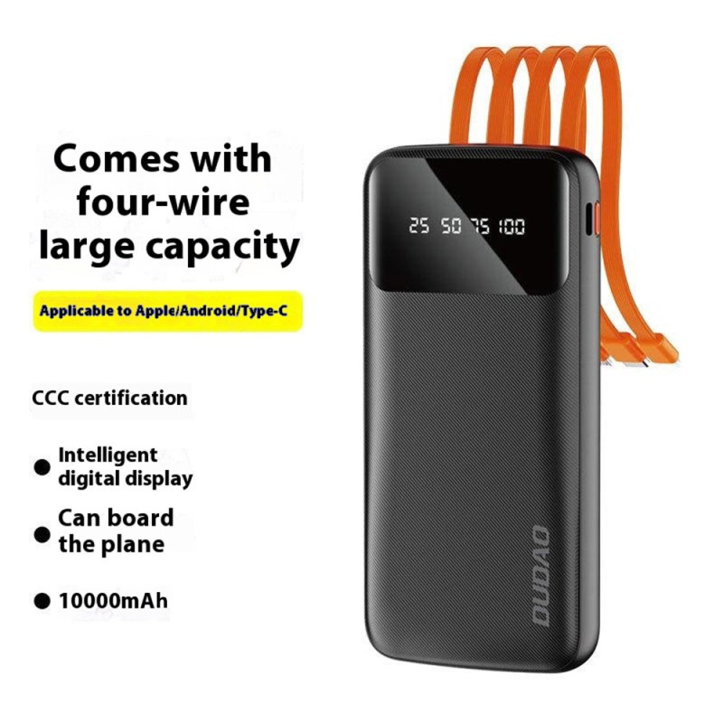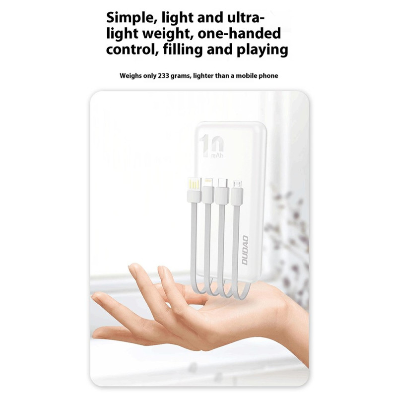 Cette batterie externe DUDAO de 10000mAh offre une solution pratique pour recharger plusieurs appareils sans transporter de câbles supplémentaires. Elle intègre trois câbles de sortie et un câble d’entrée USB, permettant une utilisation immédiate en déplacement. Capable d’alimenter jusqu’à cinq appareils en même temps, elle convient aussi bien à un usage personnel qu’au partage. Son format compact la rend facile à tenir et à glisser dans un sac. L’affichage digital à quatre niveaux permet de suivre clairement le niveau de batterie restant pour mieux anticiper la recharge.