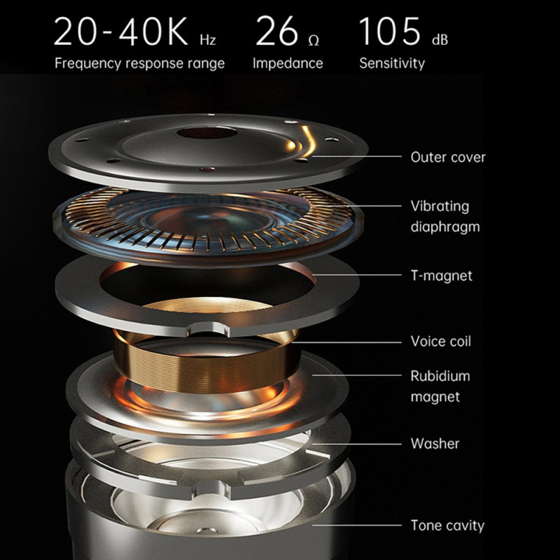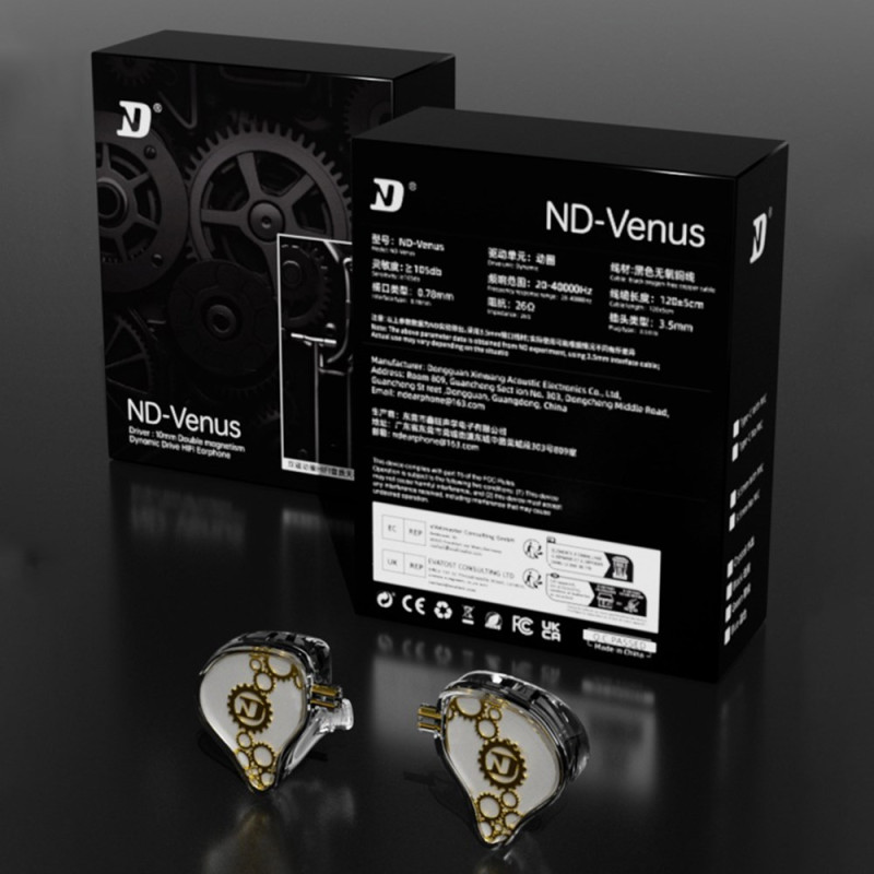 Les écouteurs ND Venus utilisent un transducteur dynamique à double diaphragme magnétique, conçu pour offrir une restitution sonore détaillée et puissante, avec une clarté remarquable dans les voix et une extension propre jusqu’à 40 kHz. Leur architecture interne repose sur un réglage acoustique multicouche et une cavité arrière ventilée, optimisant la pression d’air pour renforcer l’impact et améliorer la dynamique. Le câble détachable à double pin (0,75–0,78 mm) permet un remplacement ou une montée en gamme. Inspiré de l’esthétique mécanique, le design reprend des formes industrielles fines et précises, tandis que la conception ergonomique assure un port stable et agréable.