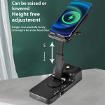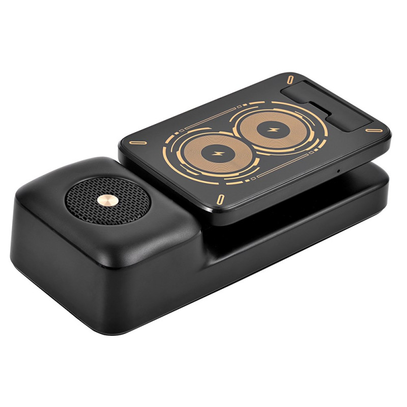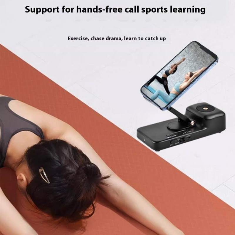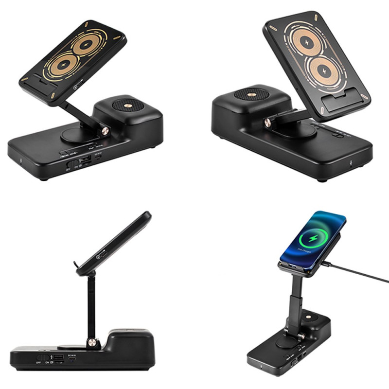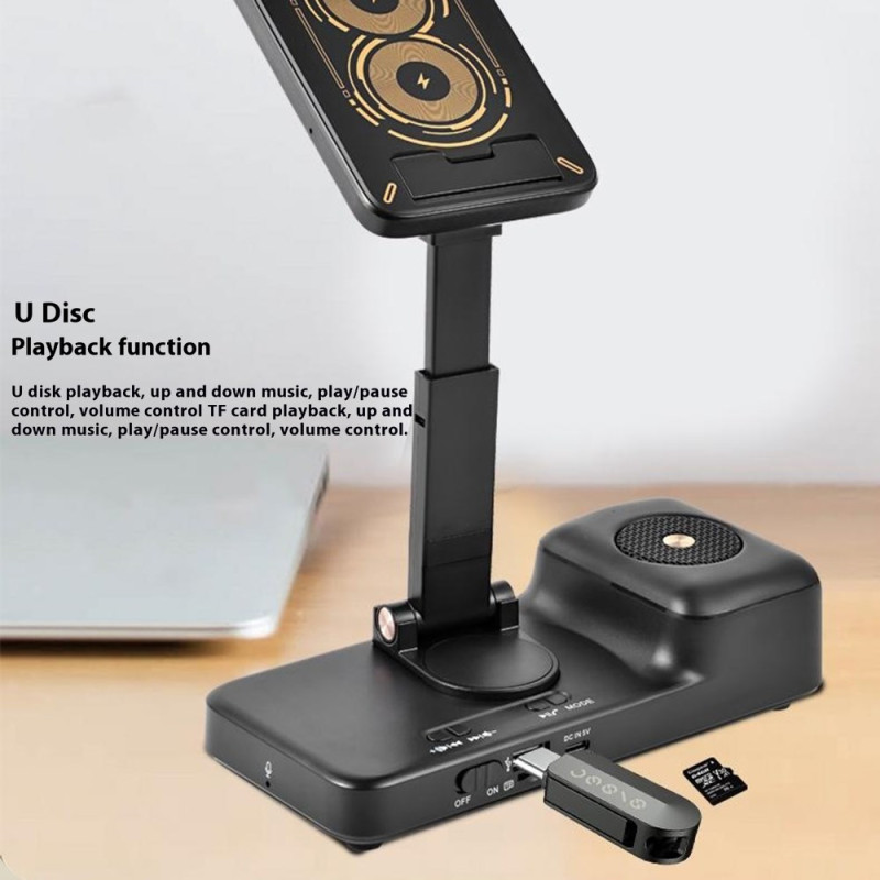 Support ajustable 3-en-1 alliant enceinte Bluetooth 5.1, chargeur sans fil et station d'accueil ergonomique. Design pliable avec rotation 360°, haut-parleurs double aimant 5W et batterie intégrée de 1500mAh. Parfait pour le bureau ou les déplacements.
