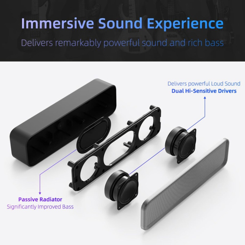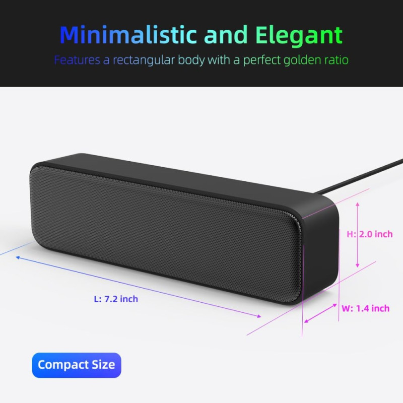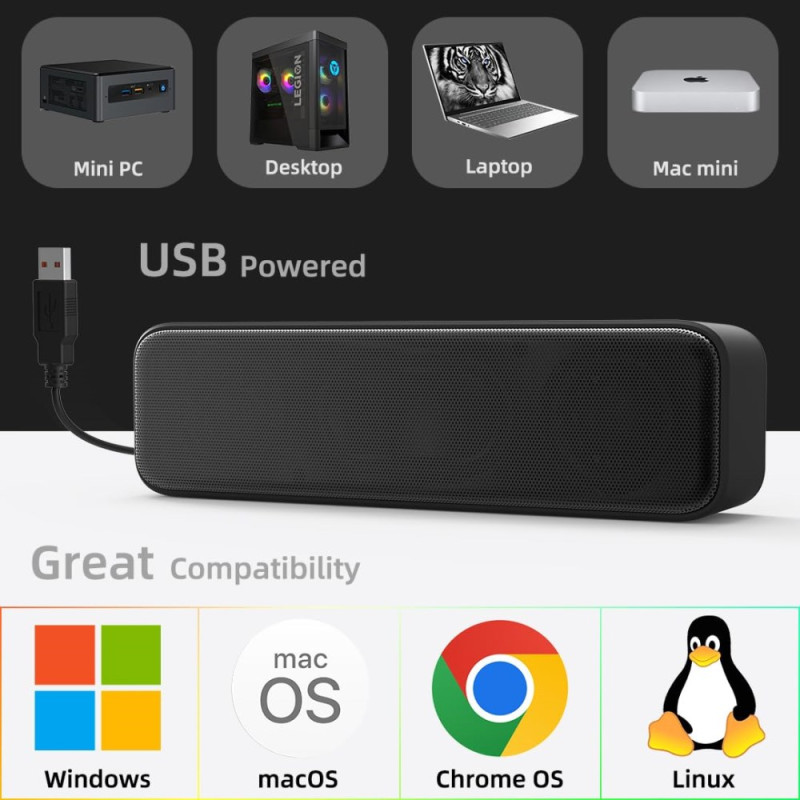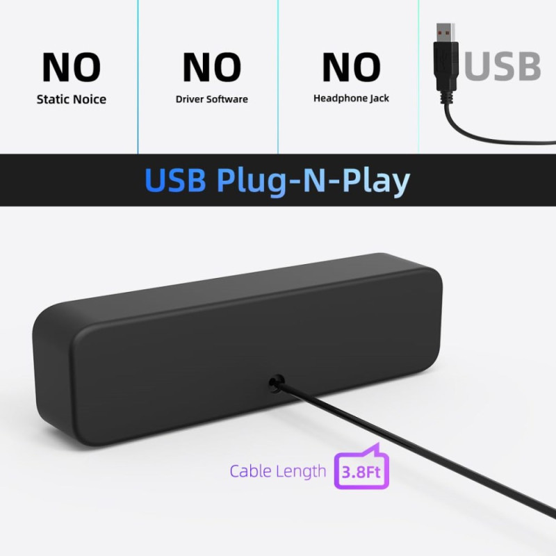 Cette barre de son USB offre un rendu audio puissant grâce à deux haut-parleurs de 40 mm délivrant chacun 3 W, complétés par un radiateur passif pour renforcer les basses. Son format compact permet de l’installer facilement sur un bureau sans encombrement, tout en améliorant nettement l’expérience sonore pour la musique, les films ou les appels en visioconférence. L’alimentation USB assure une installation immédiate sans pilote ni alimentation externe. Son design sobre aux lignes noires épurées s’intègre harmonieusement à tout espace de travail ou intérieur moderne.
