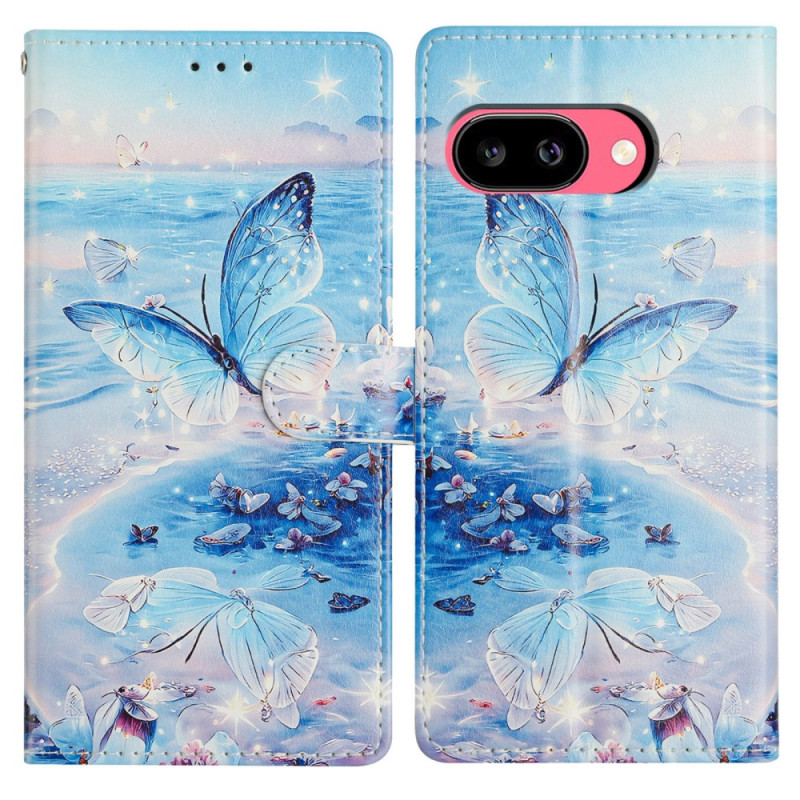 Étui portefeuille élégant pour Google Pixel 10A avec motif papillon océan. Doté de 2 emplacements pour cartes, 1 compartiment photo et une poche latérale spacieuse. Support intégré pour visionnage mains libres et dragonne détachable incluse.
