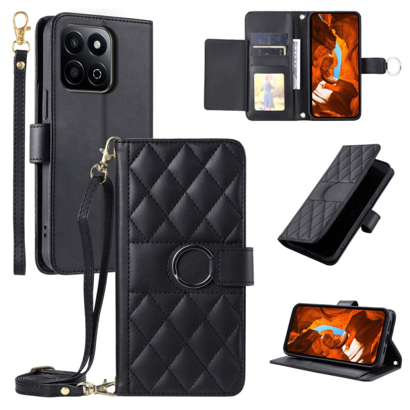 Étui portefeuille élégant en cuir avec design losange sophistiqué. Comprend un anneau clasp premium, 5 emplacements pour cartes, une poche pour pièces et un support pliable. Livré avec deux bretelles pour port à la main ou en bandoulière.
