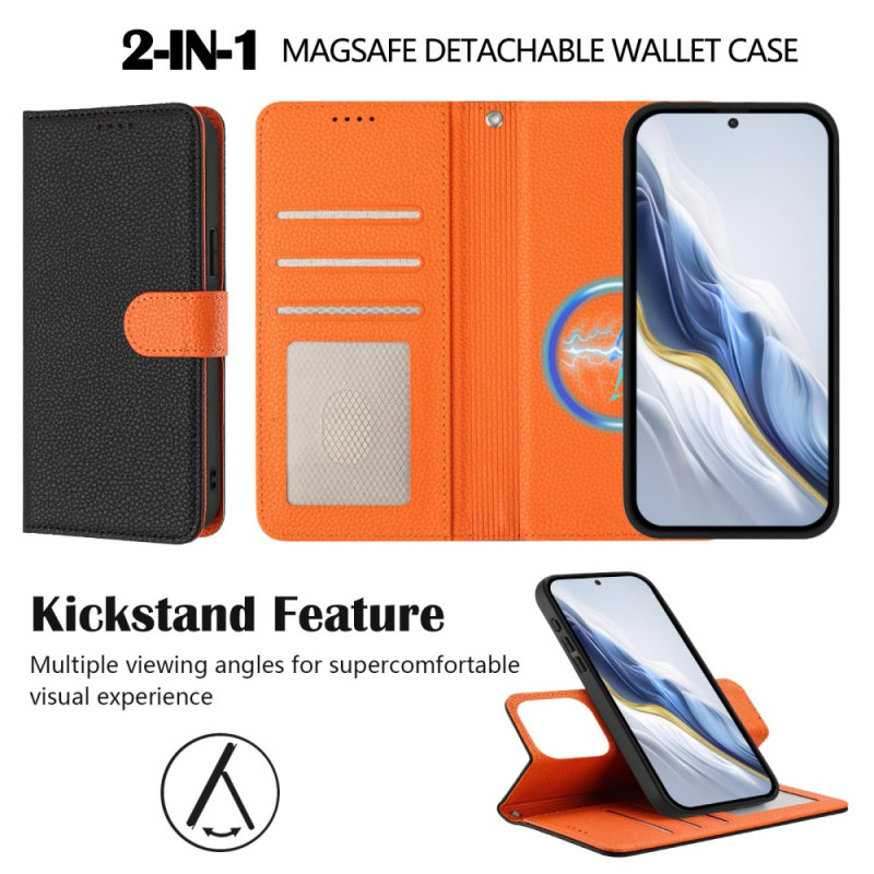 • Portefeuille magnétique détachable avec 2 fentes pour cartes, 1 compartiment photo et un espace pour espèces, faisant également office de support pratique pour visionnage mains libres