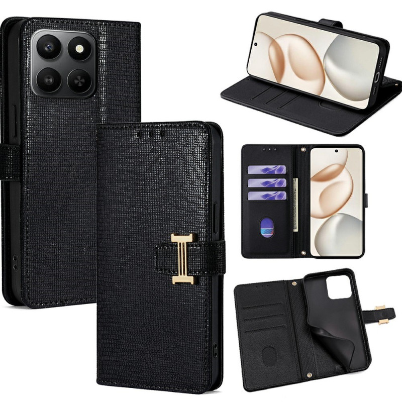 Étui portefeuille élégant avec boucle métallique en I et fermeture magnétique. Dispose de 3 emplacements pour cartes, 1 poche pour billets et un support ajustable pour une utilisation mains libres. Protection intégrale contre les rayures et les chutes.