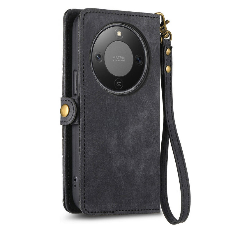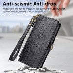 Étui portefeuille élégant avec motif géométrique, combinant cuir PU et TPU pour une protection optimale. Doté de 3 emplacements pour cartes, 1 poche pour billets, une poche zippée extérieure et un support intégré. La dragonne détachable offre un transport pratique et stylé.