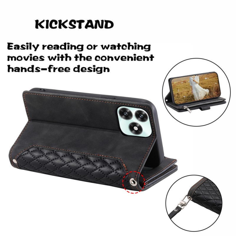 Découvrez notre étui portefeuille élégant en cuir PU avec motif losange matelassé. Doté de multiples emplacements pour cartes, d'une poche zippée et d'une dragonne pratique, il offre une protection complète tout en servant de support mains libres.