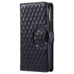 Étui portefeuille en cuir PU avec motif losange pailleté et poche zippée. Design élégant et pratique avec support pliable intégré et dragonne de sécurité. Protection complète contre les chocs et rayures pour votre smartphone Honor.