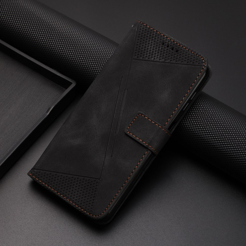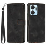 Étui portefeuille élégant en cuir PU et TPU pour Honor X7a 4G. Design moderne avec motifs triangulaires, fonction support intégrée, 3 emplacements pour cartes et fermeture magnétique sécurisée. Protection complète contre les chocs au quotidien.