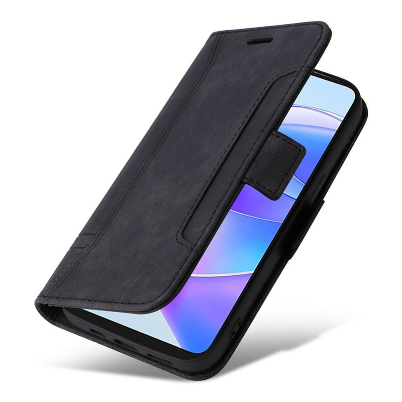 Étui portefeuille élégant en cuir PU avec support intégré pour Honor X7a 4G. Doté de 3 fentes pour cartes, 1 poche pour billets et d'une fermeture magnétique double pour une sécurité optimale. Design sophistiqué avec motif de lignes imprimées.
