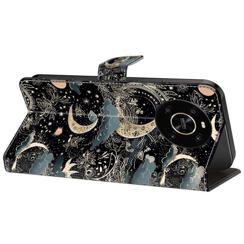 Étui élégant pour Honor X9 5G combinant style et fonctionnalité. Design raffiné avec motif lune, portefeuille intégré avec 2 emplacements cartes et 1 poche billets. Support ajustable pour visionnage mains libres. Protection intégrale antichoc et anti-rayures.