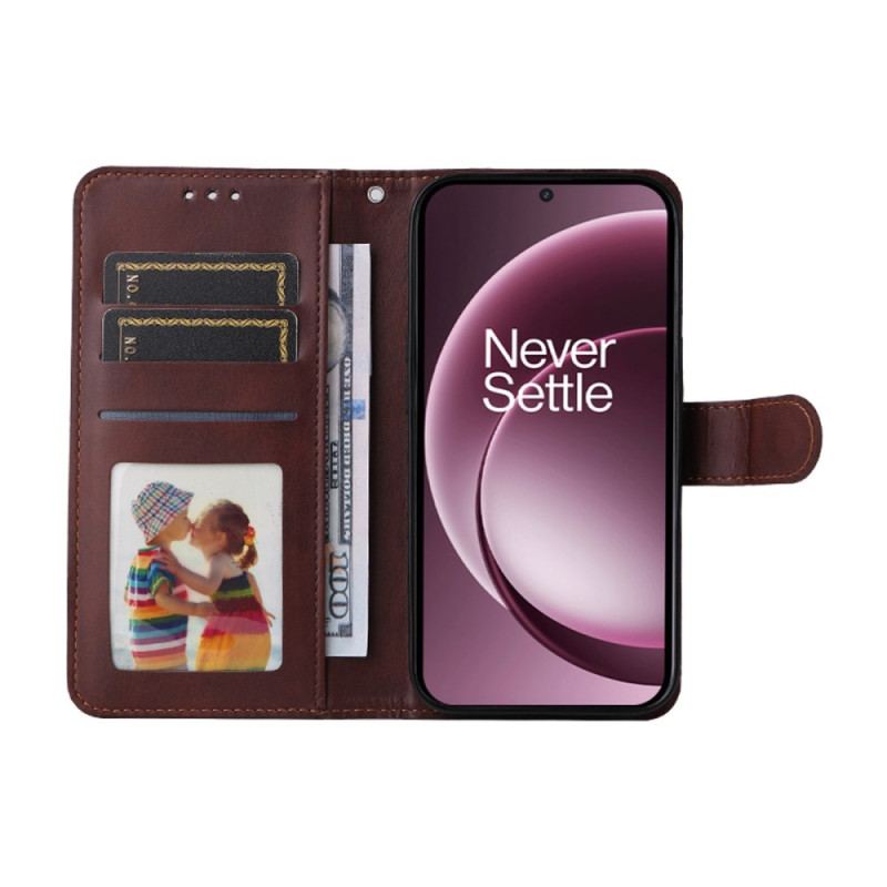 Étui portefeuille élégant en cuir PU texturé pour OnePlus 15 5G. Comprend 3 emplacements pour cartes, un support pliable intégré, une dragonne amovible et un protecteur d'écran ultra-fin de 0,18 mm compatible avec le déverrouillage.