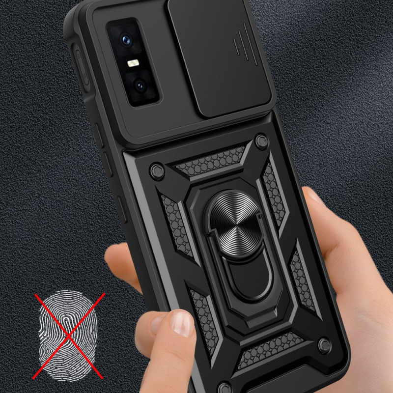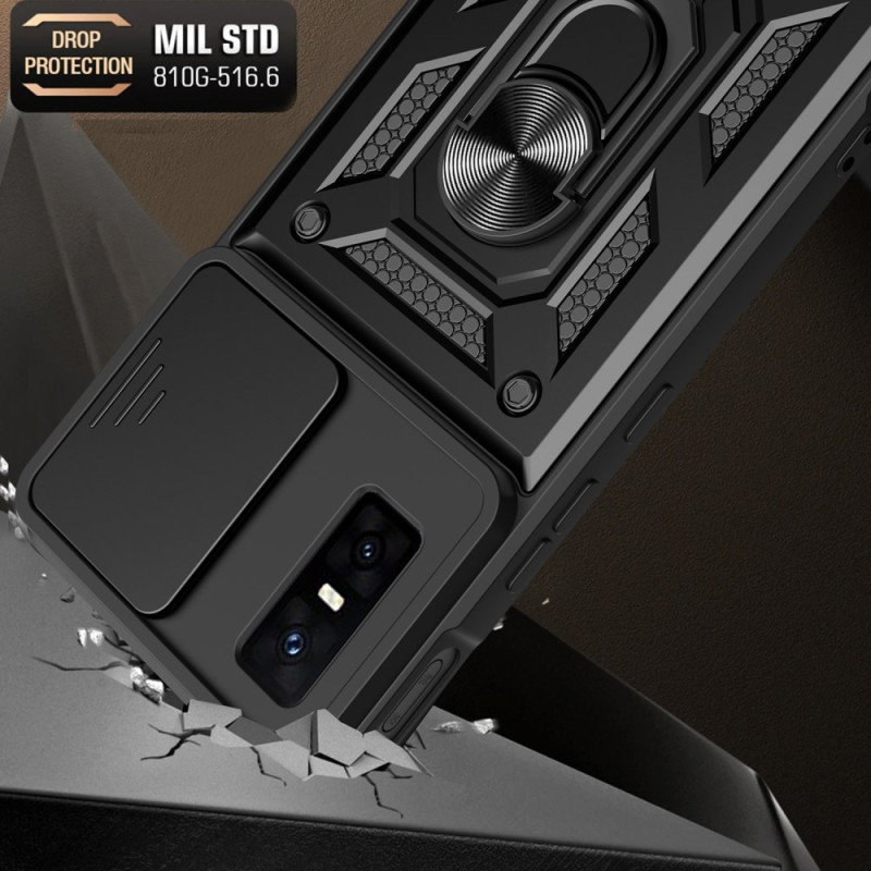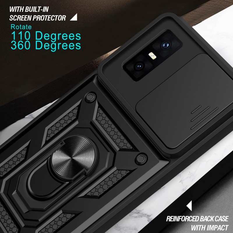 Coque de protection premium pour Infinix GT 30 Pro 5G avec protection caméra coulissante, support rotatif intégré et résistance aux chocs de qualité militaire. Compatible avec les supports magnétiques pour voiture.