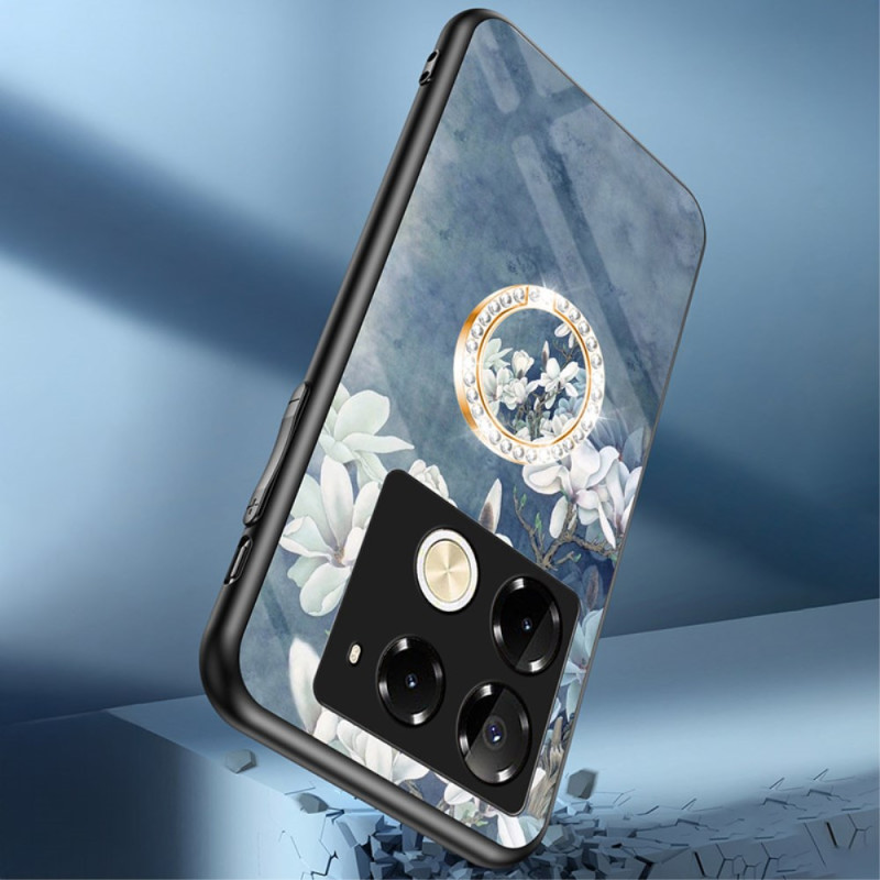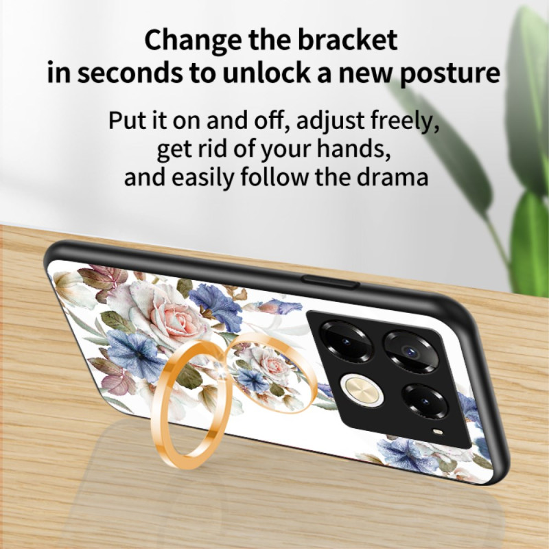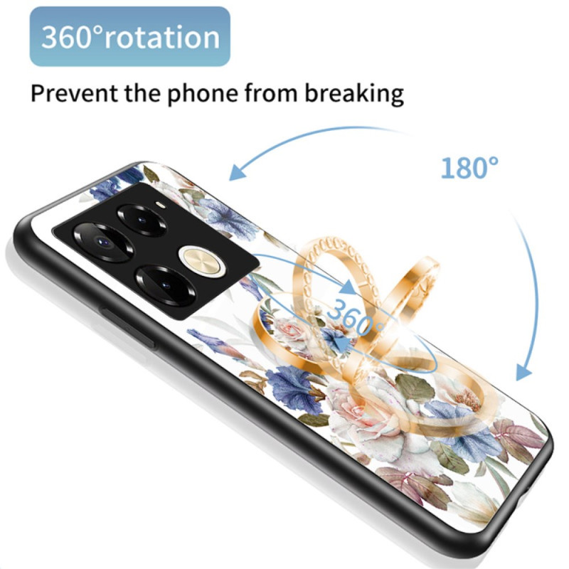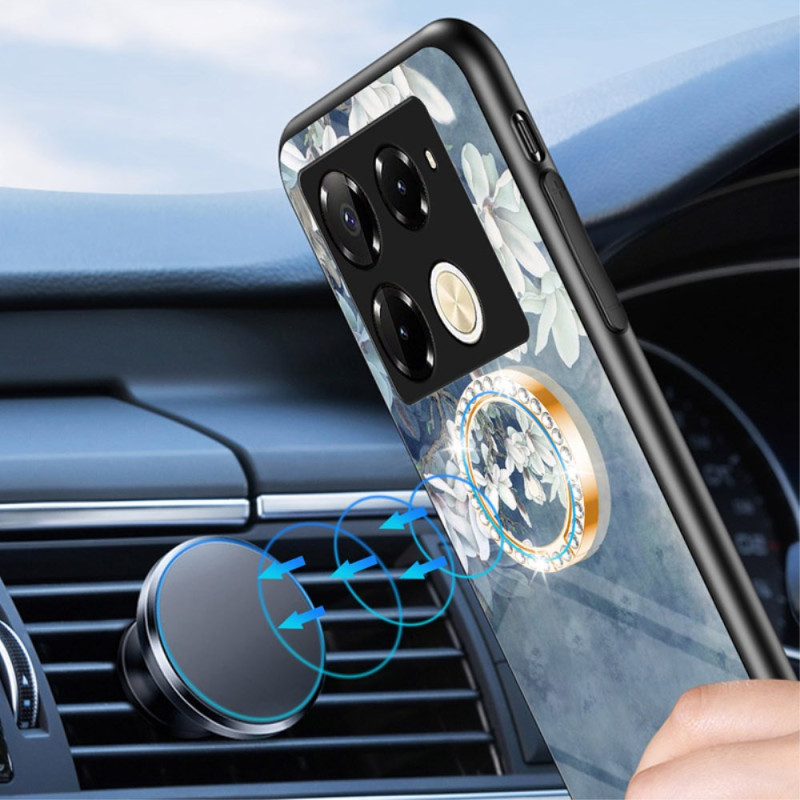 Protégez votre Infinix Note 40 Pro 4G avec cette coque élégante ornée de motifs floraux. Dotée d'un anneau support pliable avec strass, d'un dos en verre trempé résistant et d'une plaque métallique intégrée pour support magnétique.