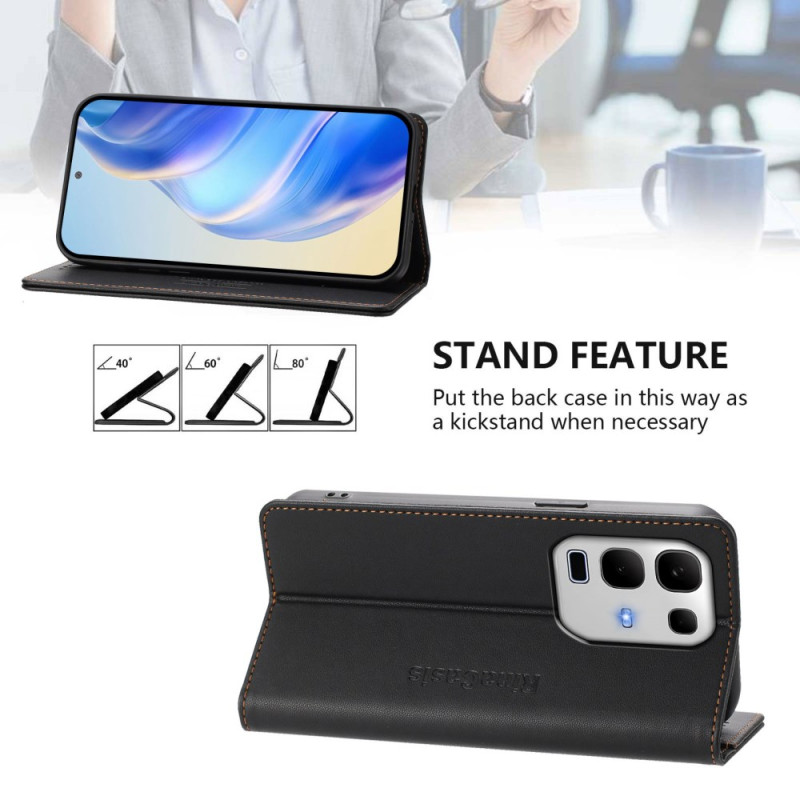 Étui multifonction pour Infinix Note 50S 5G combinant élégance et praticité. Intègre un portefeuille avec protection RFID anti-piratage, un support ajustable à 3 angles et une fermeture magnétique sécurisée pour protéger votre téléphone au quotidien.