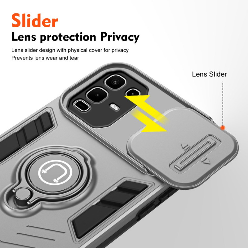 Protégez votre Infinix Note 50S 5G avec cette coque innovante dotée d'une protection caméra coulissante, d'un anneau support et d'un support intégré. Compatible avec les supports magnétiques pour voiture, elle offre une protection complète contre les chocs et les rayures.