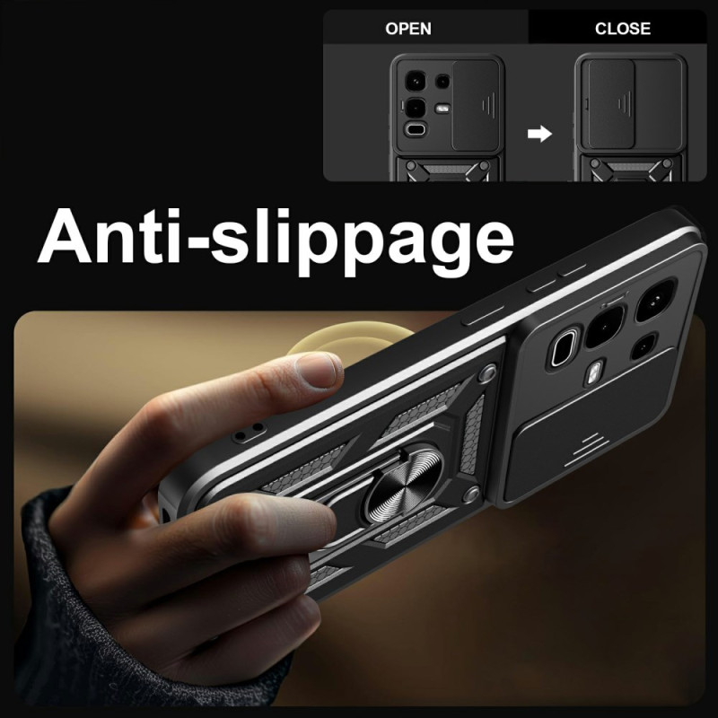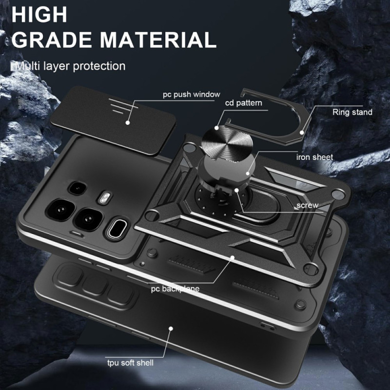 Protégez votre Infinix Note 50s 5G avec cette coque robuste dotée d'une protection caméra coulissante innovante, d'un support rotatif intégré et d'une résistance militaire aux chocs. Compatible avec les supports magnétiques pour voiture.