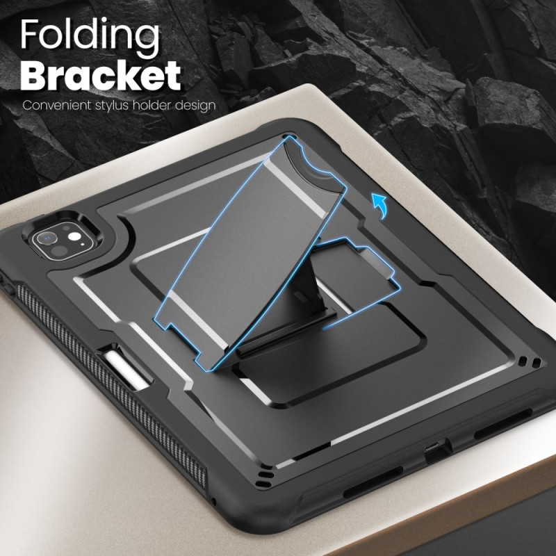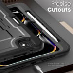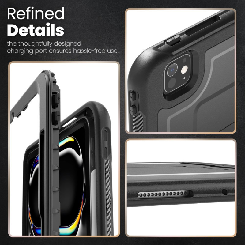 Cet étui robuste pour iPad Pro 11 (2025) / 11 (2024) offre une protection durable avec son mélange de PC et TPE. Il comprend un support pliable en alliage de zinc, un espace de rangement pour stylet, des découpes précises pour un accès facile à toutes les fonctionnalités, une protection de caméra surélevée et une bandoulière détachable pour un transport pratique.