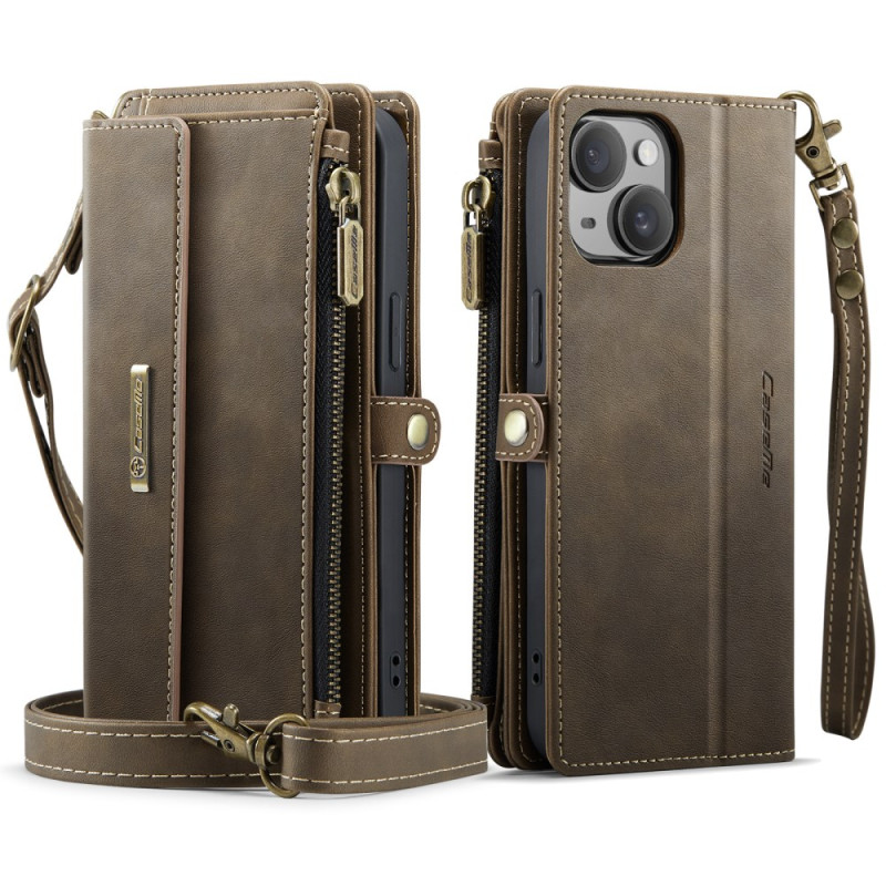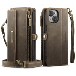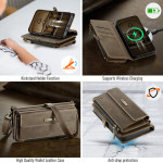 Étui portefeuille multifonction pour iPhone 13 Mini avec technologie anti-RFID. Dispose de 9 emplacements cartes, poche zippée et support mains-libres. Conception polyvalente permettant de porter en sac à bandoulière ou pochette.