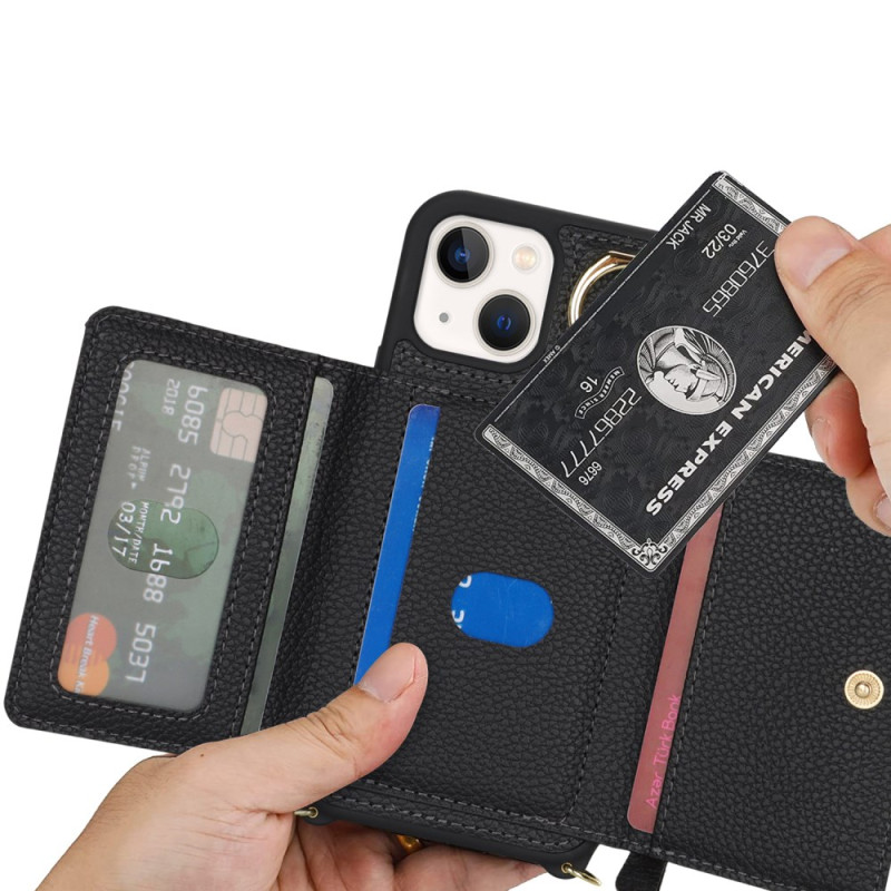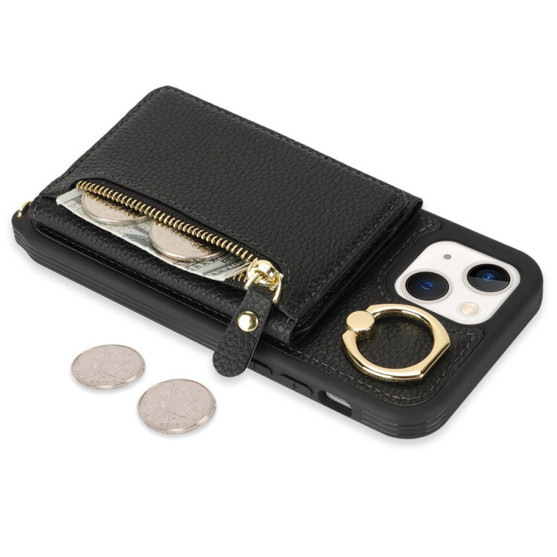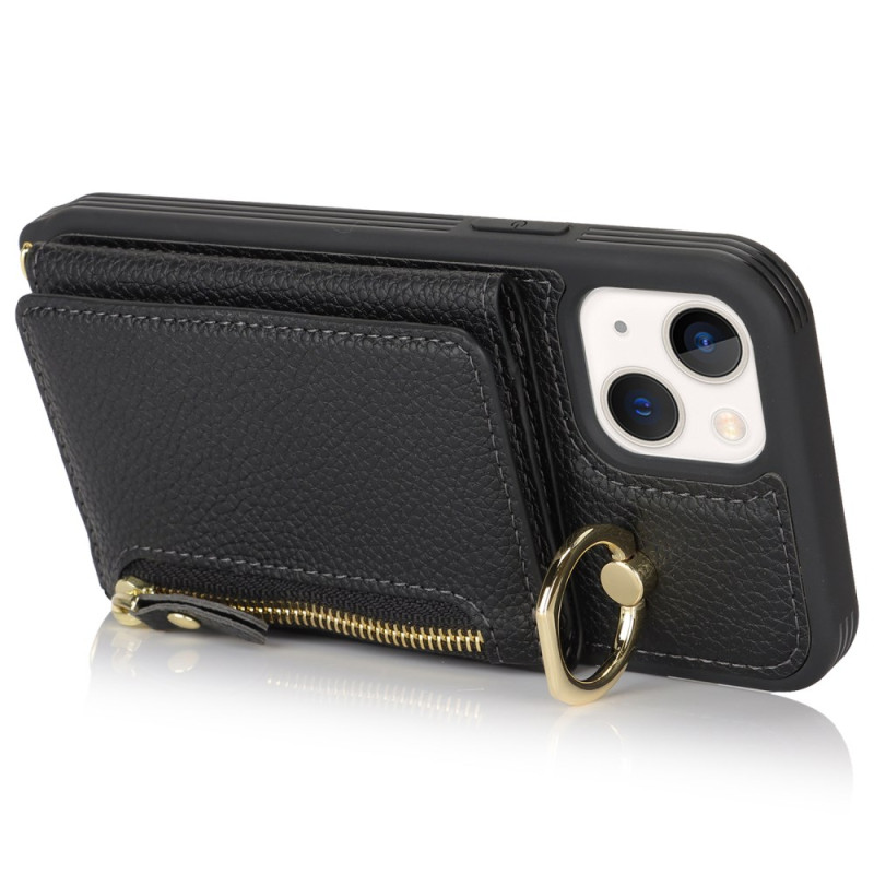 Étui multifonctionnel en cuir PU et TPU pour iPhone 13 Mini. Poche zippée intégrée pour ranger vos essentiels, fentes pour cartes bancaires et anneau support rotatif. Livré avec bandoulière amovible pour un transport pratique au quotidien.