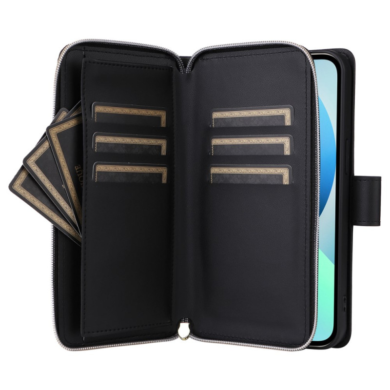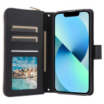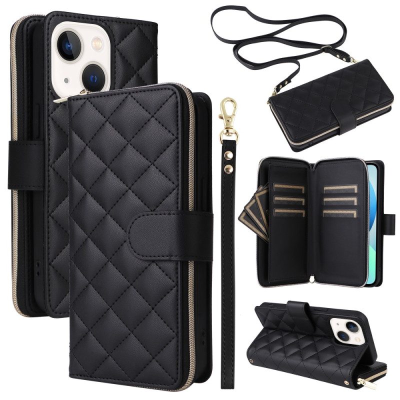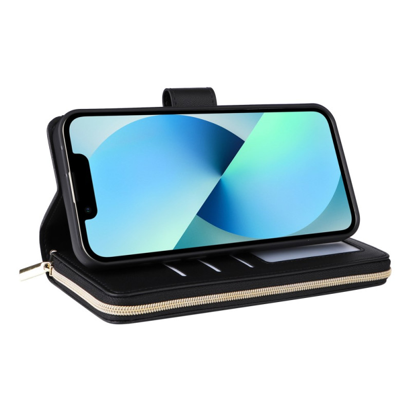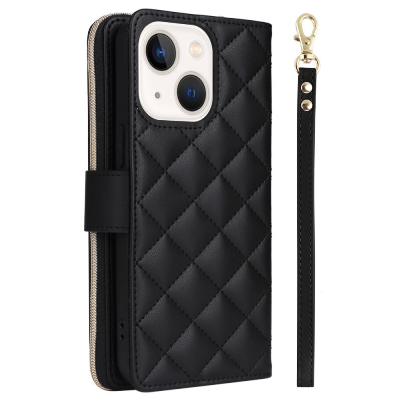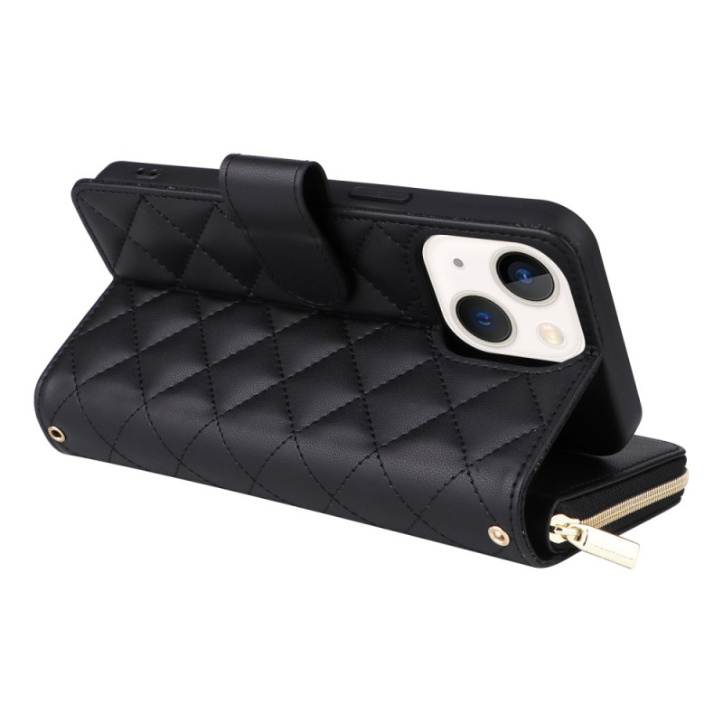 Étui portefeuille élégant en cuir PU avec fermeture éclair pour iPhone 13 mini. Design matelassé raffiné, multiples compartiments pour cartes et espèces, poche zippée supplémentaire. Fonction support intégrée et bandoulière ajustable pour un transport facile.