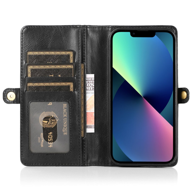 Protégez votre iPhone 13 mini avec élégance grâce à cet étui portefeuille détachable 2-en-1. Son design magnétique ingénieux combine une coque arrière fine et un portefeuille à rabat pratique avec fentes pour cartes et fermeture aimantée.