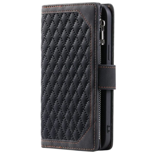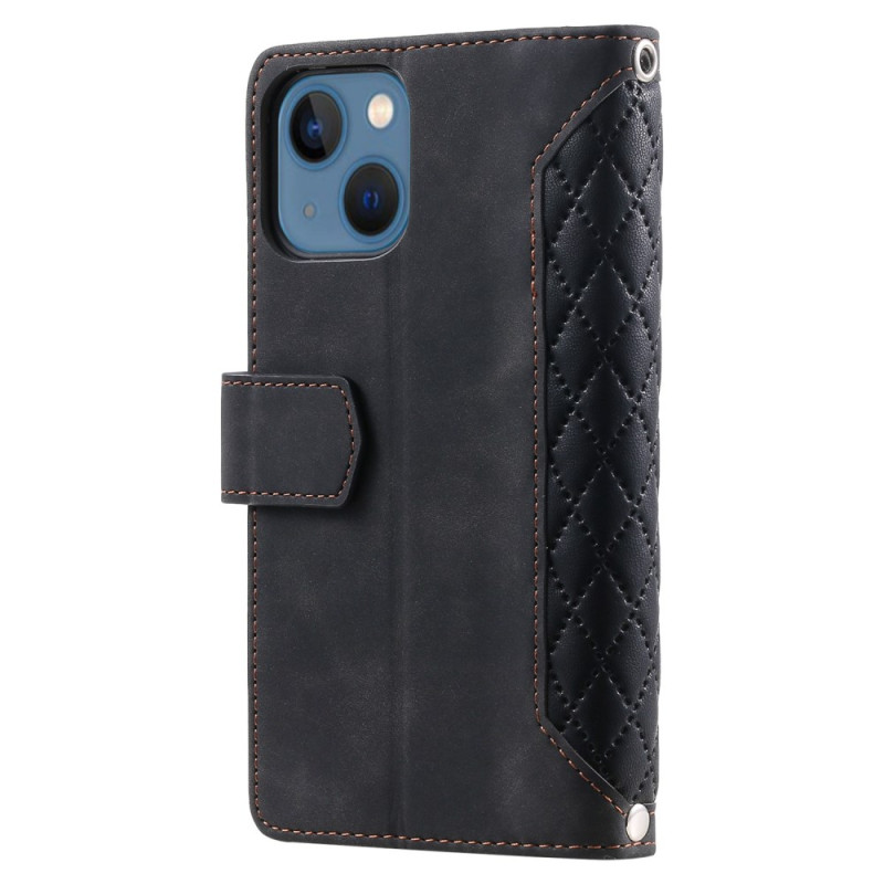 Étui portefeuille élégant avec texture losange pour iPhone 13 Mini. Doté de multiples fentes pour cartes, une poche zippée et un support mains libres. Fermeture magnétique sécurisée et dragonne incluse pour un transport facile et une protection complète.