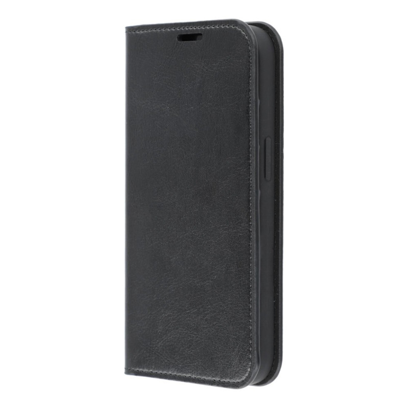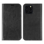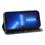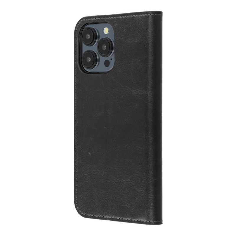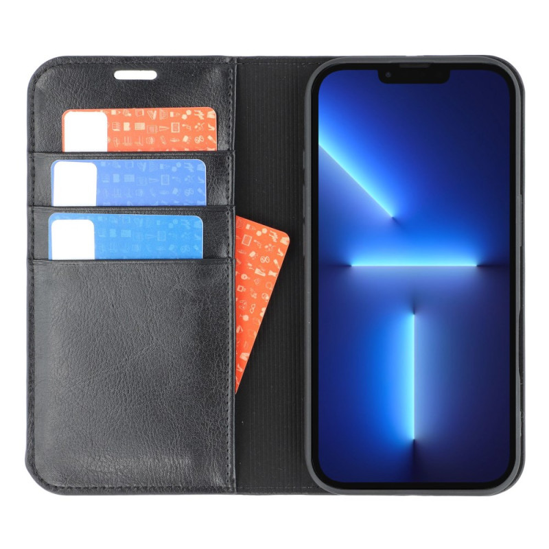 Étui portefeuille élégant en cuir véritable fendu pour iPhone 13 Pro Max. Doté de 3 emplacements pour cartes, d'une poche pour billets et d'un support pliable pratique. Fermeture magnétique sécurisée pour une protection optimale de votre téléphone.