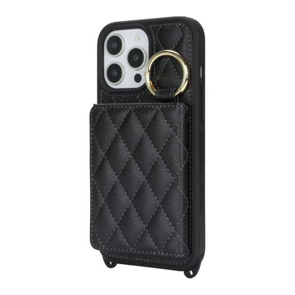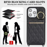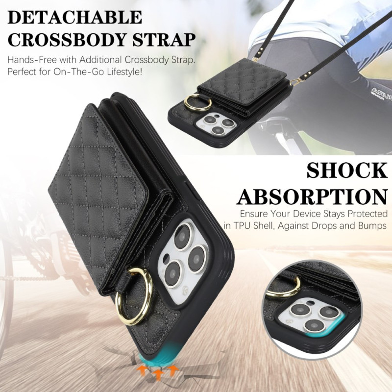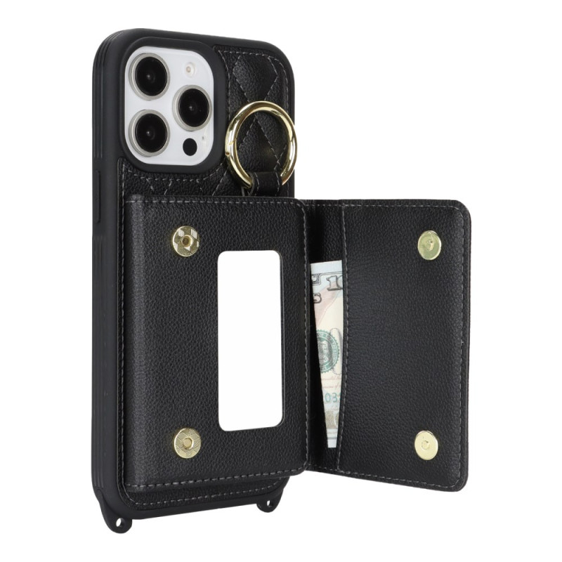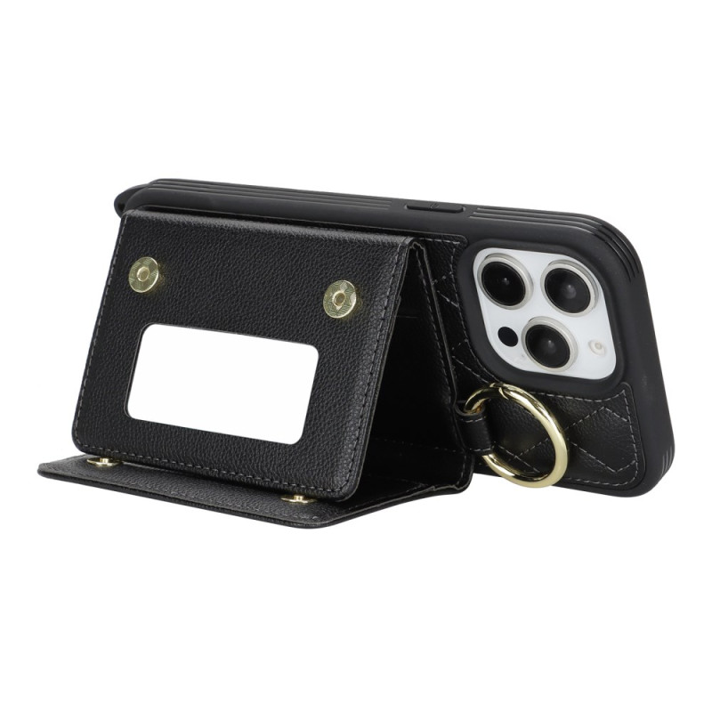 Coque multifonctionnelle avec cordon ajustable, 3 emplacements pour cartes, miroir intégré et protection RFID. Conception élégante à motif quadrillé avec support pliable pour une utilisation mains libres optimale.