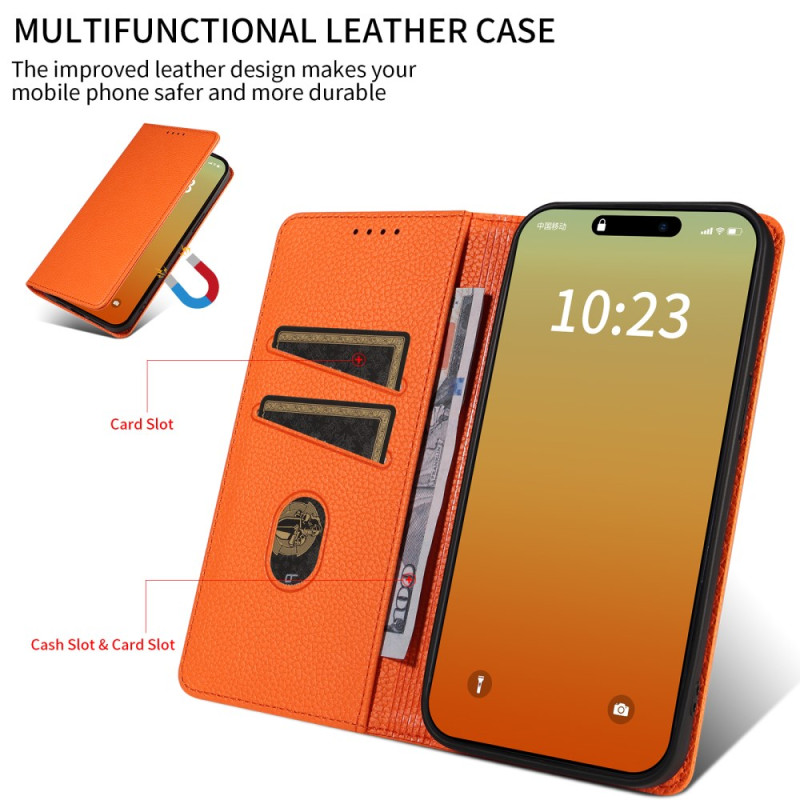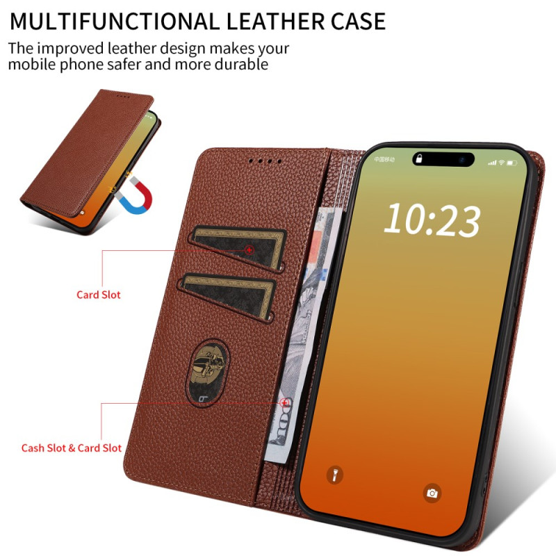 Étui portefeuille élégant en cuir PU avec protection RFID intégrée. Doté de 2 emplacements pour cartes, 1 poche pour espèces et fermeture magnétique puissante. Design pliable servant de support ajustable pour visionnage mains libres.