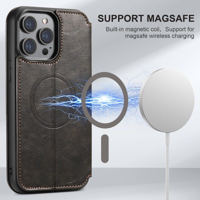 Étui portefeuille élégant en cuir PU premium pour iPhone 13 Pro Max, compatible MagSafe. Design magnétique avec 3 emplacements cartes, fonction support intégrée et protection renforcée de la caméra. Alliez style et praticité au quotidien.