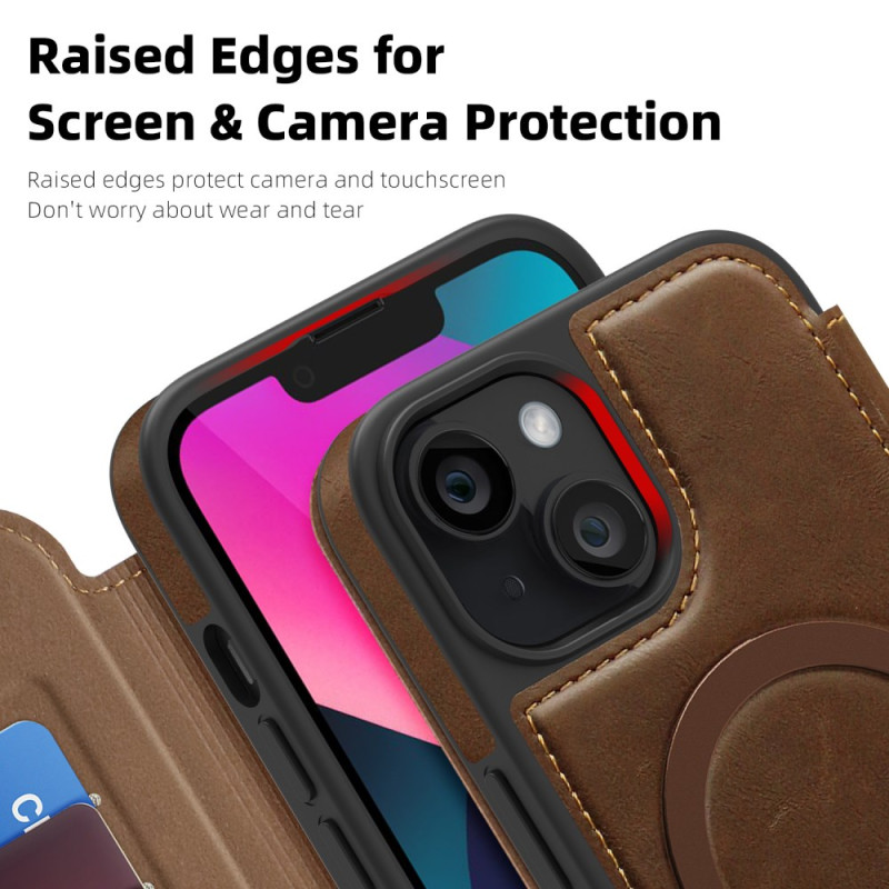 Découvrez notre coque iPhone 13 compatible MagSafe avec porte-carte intégré et technologie de blocage RFID. Fabriquée en TPU et cuir PU de haute qualité, elle offre une protection durable et élégante pour votre appareil. Ses emplacements pour cartes et ses bords surélevés assurent praticité et sécurité au quotidien.