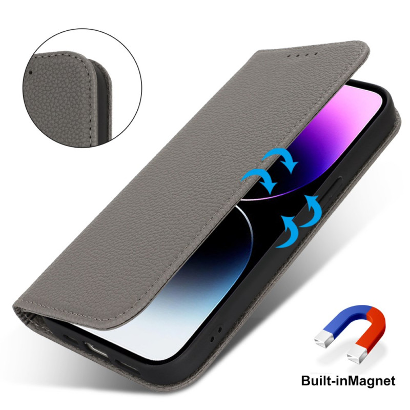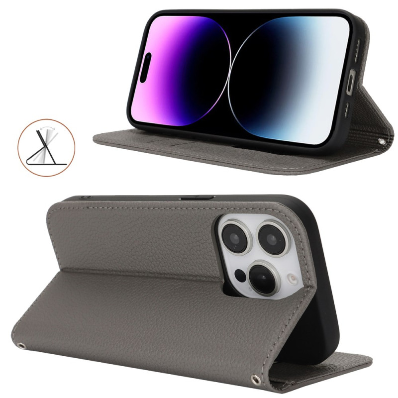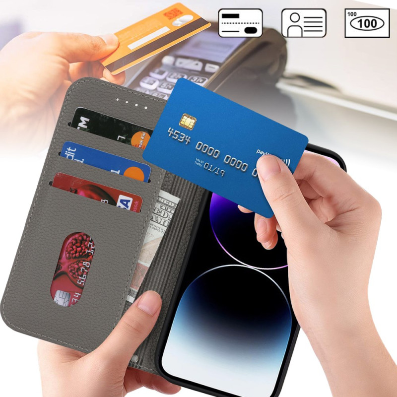Découvrez notre élégante housse portefeuille pour iPhone 14 Pro Max. Fabriquée en cuir texturé de haute qualité, elle offre un stockage pratique pour vos cartes et de l'argent. Avec sa fermeture magnétique et sa dragonne détachable, cette coque allie fonctionnalité et protection complète pour votre appareil.