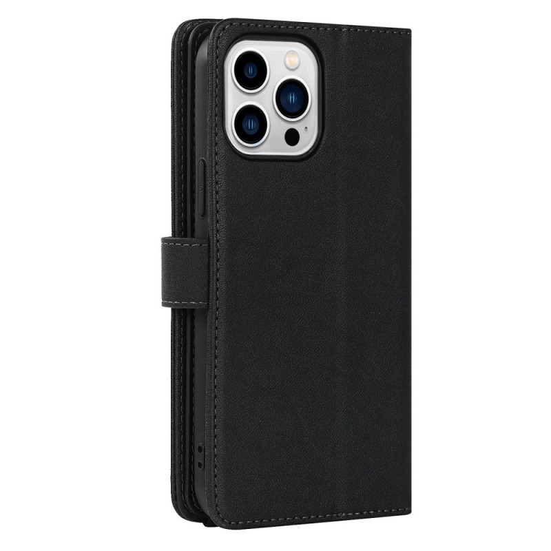 Étui portefeuille multifonction en cuir PU pour iPhone 14 Pro Max. Design tout-en-un avec multiples fentes pour cartes, poche zippée et compartiment pour espèces. Livré avec deux bandoulières détachables (poignet et épaule ajustable). Fonction support intégrée pour visionnage mains libres et fermeture magnétique sécurisée.
