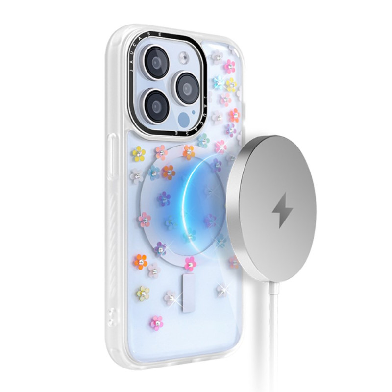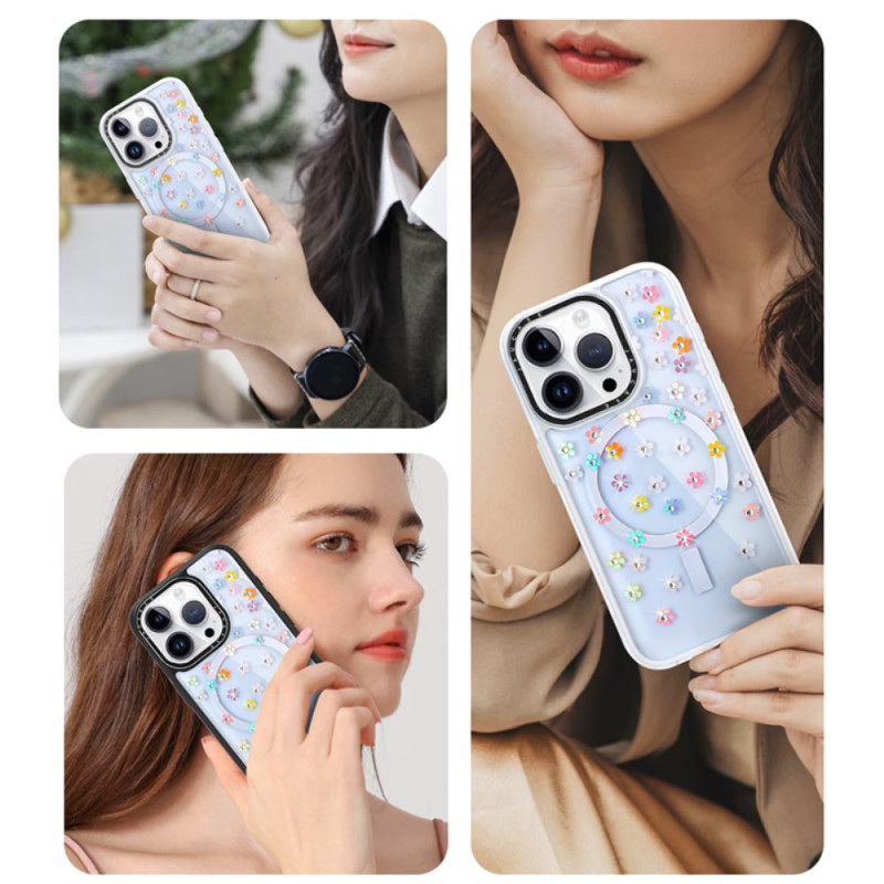 Protégez votre iPhone 14 Pro Max avec élégance grâce à cette coque ornée de fleurs et strass scintillants. Conçue en PC et TPU, elle offre une protection renforcée contre les chutes jusqu'à 3m tout en restant compatible avec la charge MagSafe.
