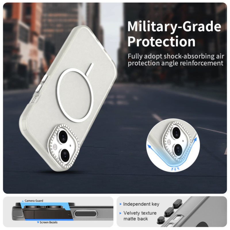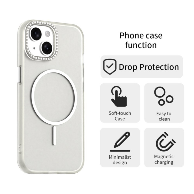 Découvrez notre coque élégante et protectrice pour iPhone 15 Plus / 14 Plus. Compatible avec MagSafe, elle offre une protection fiable contre l'usure quotidienne et les chutes mineures. Son cadre d'objectif orné de strass ajoute une touche de glamour, tandis que sa conception précise assure un accès complet à toutes les fonctionnalités de votre téléphone.