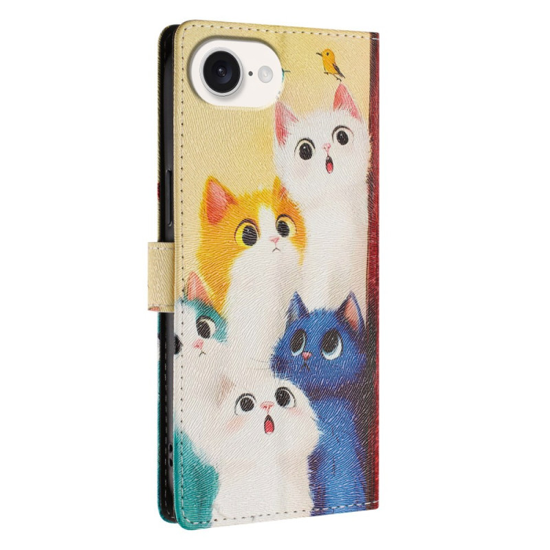 Protégez votre iPhone 17E / 16E avec style grâce à cet étui portefeuille au motif de chats colorés. Conception en cuir synthétique avec coque intérieure souple, fentes pour cartes, support réglable et dragonne amovible pour un usage quotidien pratique et élégant.