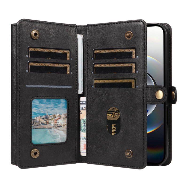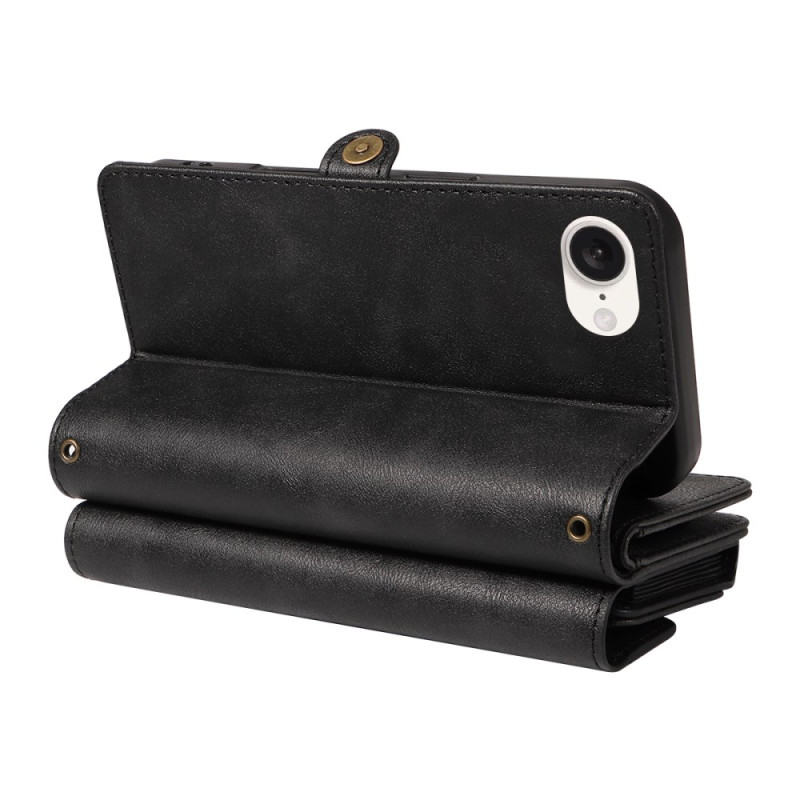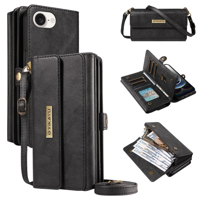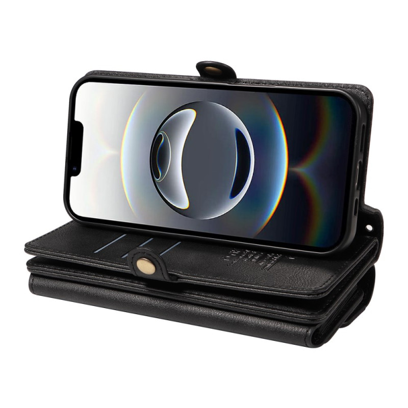 Étui portefeuille élégant en cuir PU avec bandoulière amovible. Protection RFID intégrée, 9 emplacements pour cartes, compartiment zippé et fonction support. Design sophistiqué alliant style et fonctionnalité pour protéger votre iPhone au quotidien.