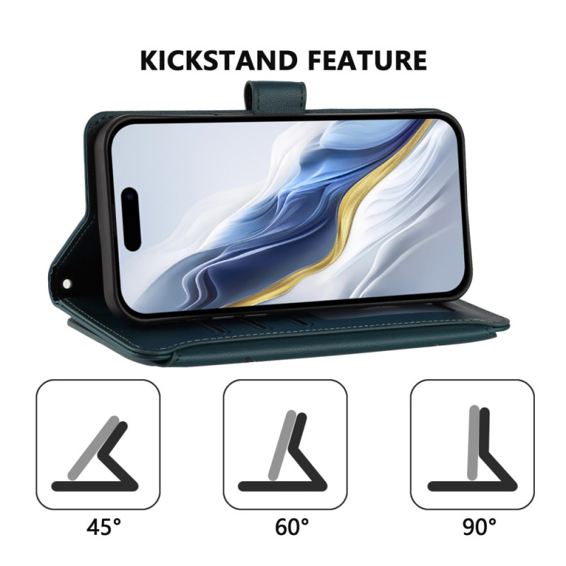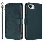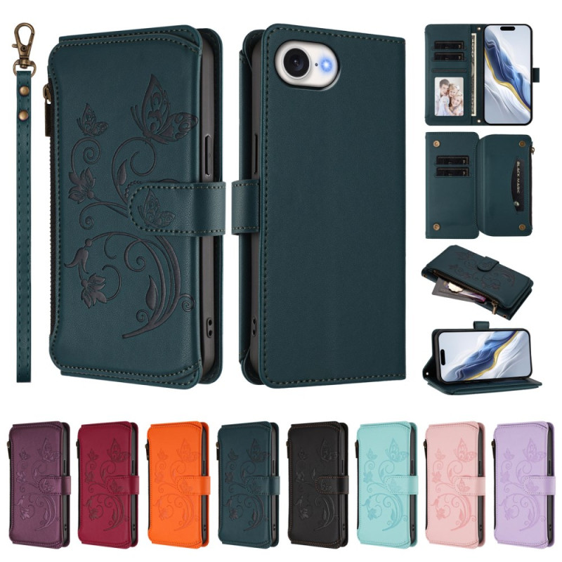 Étui portefeuille élégant en cuir PU avec motif papillon et floral embossé. Dispose de 6 emplacements pour cartes, protection RFID, fermeture magnétique sécurisée, fonction support et dragonne assortie pour un transport facile.