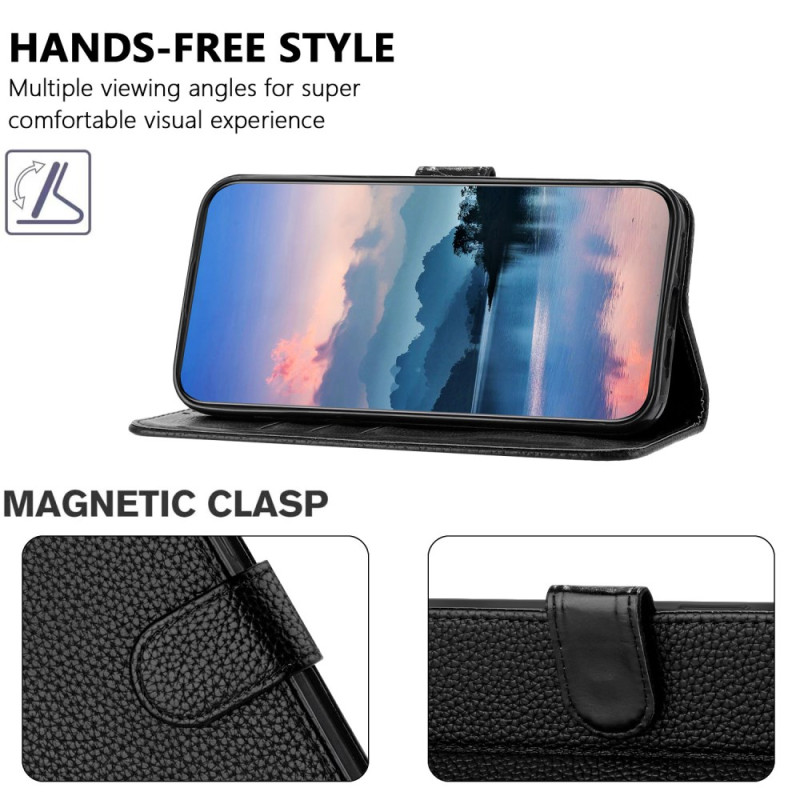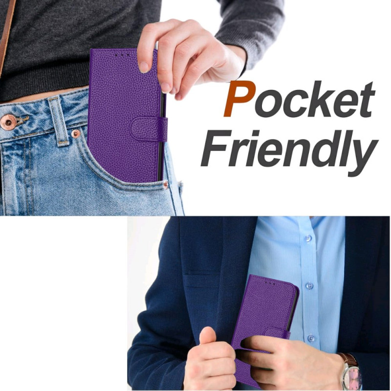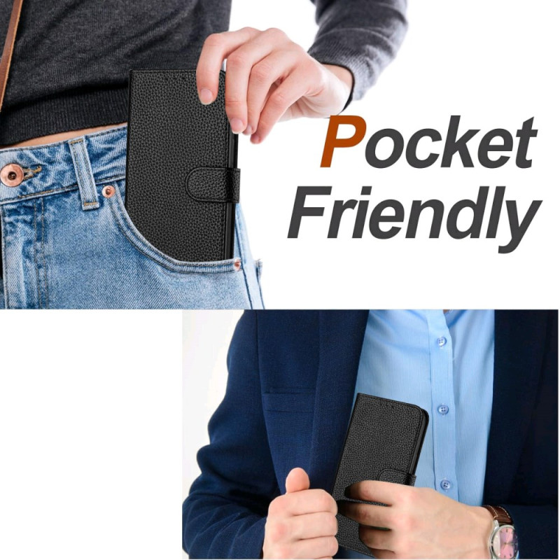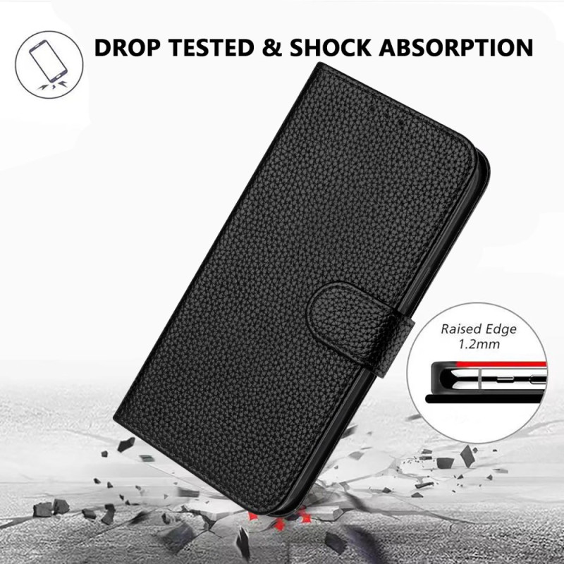 Étui portefeuille élégant en cuir texture litchi pour iPhone 17E / 16E. Doté d'un support intégré, 3 emplacements pour cartes, fermeture magnétique sécurisée et dragonne amovible. Protection renforcée contre les chocs et les chutes.