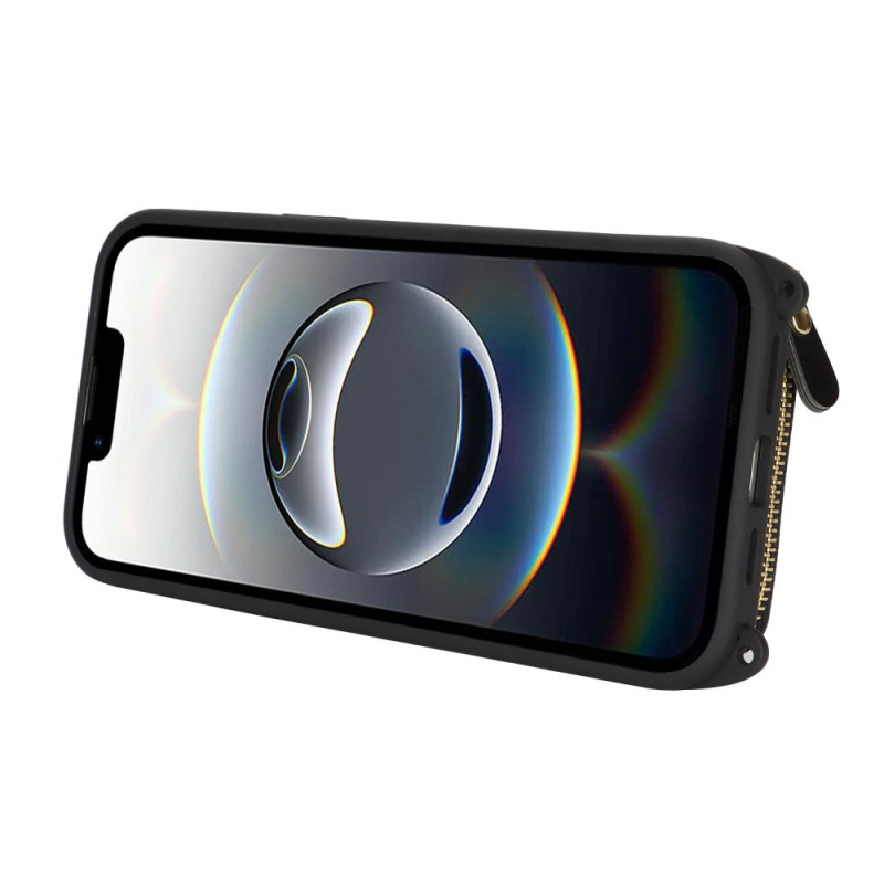 Coque multifonction en cuir PU avec portefeuille zippé, porte-cartes, support intégré et anneau de maintien. Comprend une bandoulière ajustable pour un transport mains libres. Protection complète contre les chocs et rayures.
