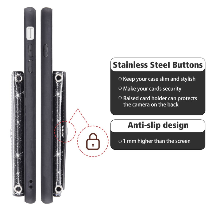 Coque élégante à paillettes avec porte-cartes intégré, support mains-libres et bandoulière amovible. Protection complète en cuir PU et TPU avec fermeture sécurisée. Idéale pour transporter vos cartes essentielles tout en protégeant votre téléphone.