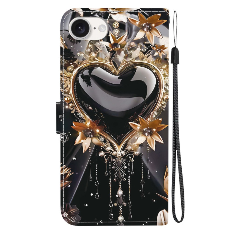 Élégant étui portefeuille avec motif cœur noir et or pour iPhone 17E / 16E. Design sophistiqué avec support pliable intégré, fentes pour cartes et dragonne assortie. Protection magnétique complète alliant style et fonctionnalité au quotidien.