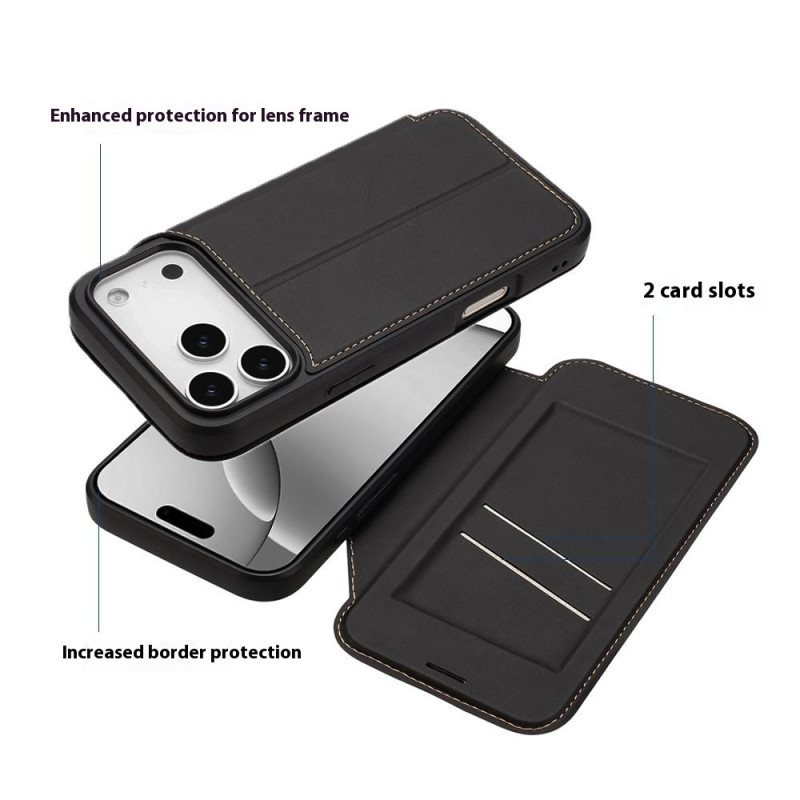 Élégante et fonctionnelle, la housse flip en cuir pour iPhone 17 Pro Max protège efficacement votre smartphone tout en ajoutant une touche raffinée. Son rabat magnétique sécurise parfaitement l’appareil et vos cartes, tandis que la coque intérieure en TPU absorbe les chocs et prévient les rayures. À l’intérieur, deux emplacements dédiés permettent de transporter cartes et indispensables sans avoir besoin d’un portefeuille. Discrète et pratique, la housse se transforme également en support mains libres pour profiter confortablement de vos vidéos ou appels.