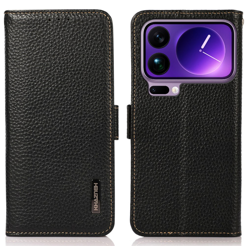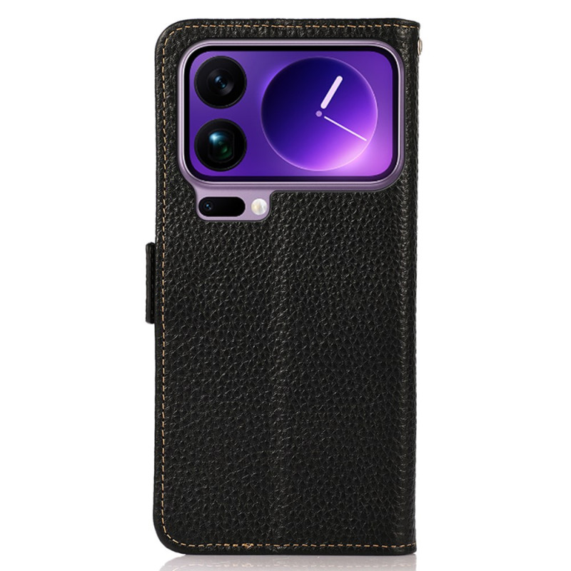 Étui en cuir véritable pour Xiaomi 17 Pro Max avec texture litchi élégante. Offre une protection RFID, des emplacements pour cartes et une fonction support. Conception fine avec TPU léger et rabat magnétique double pour une utilisation facile et une protection complète contre les rayures et les chutes.